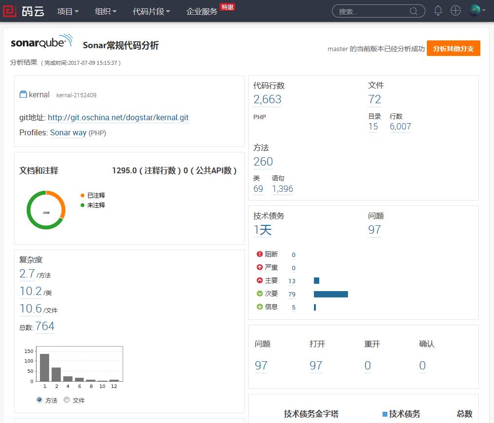 借助于开源中国码云上的代码分析服务,可以得到以下Sonar分析报告,从中可以看到新版框架的核心部分技术债务仅有1天。